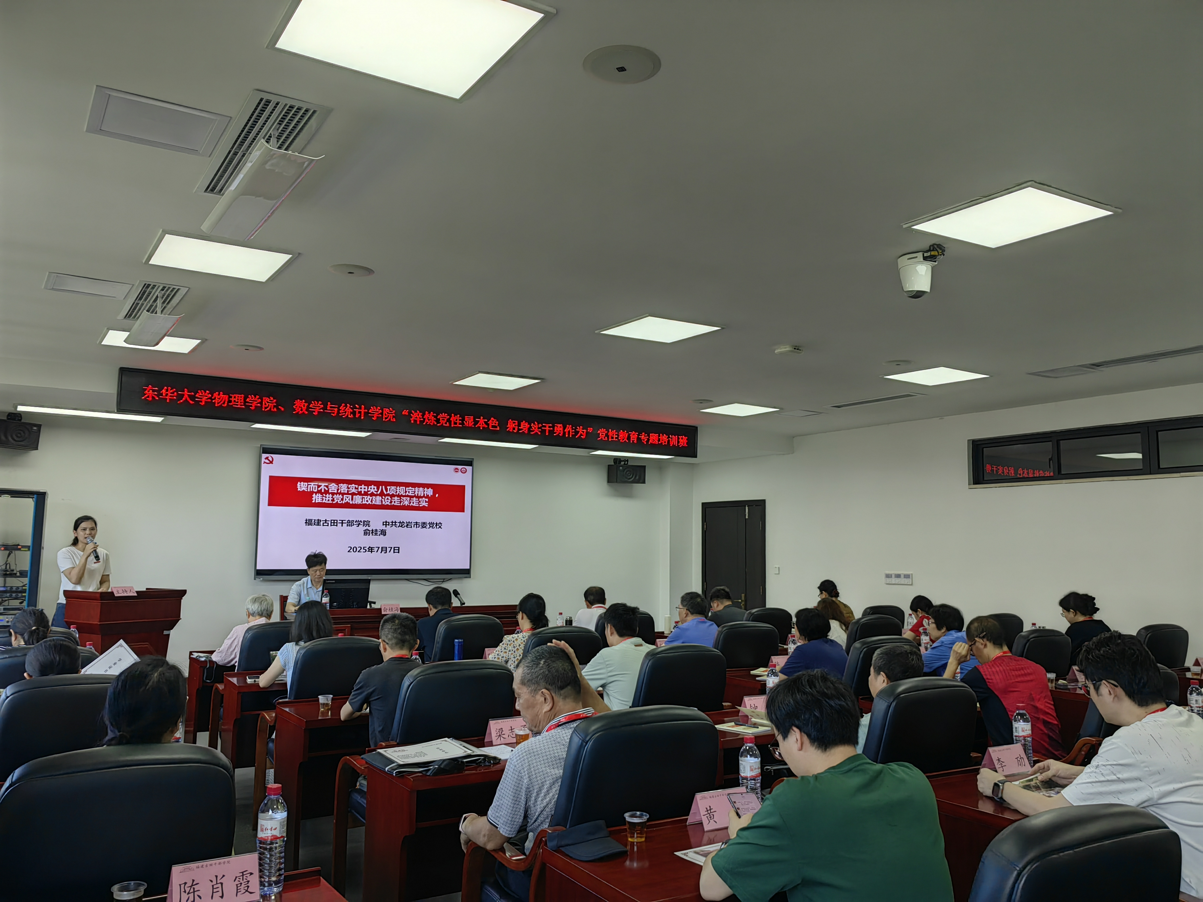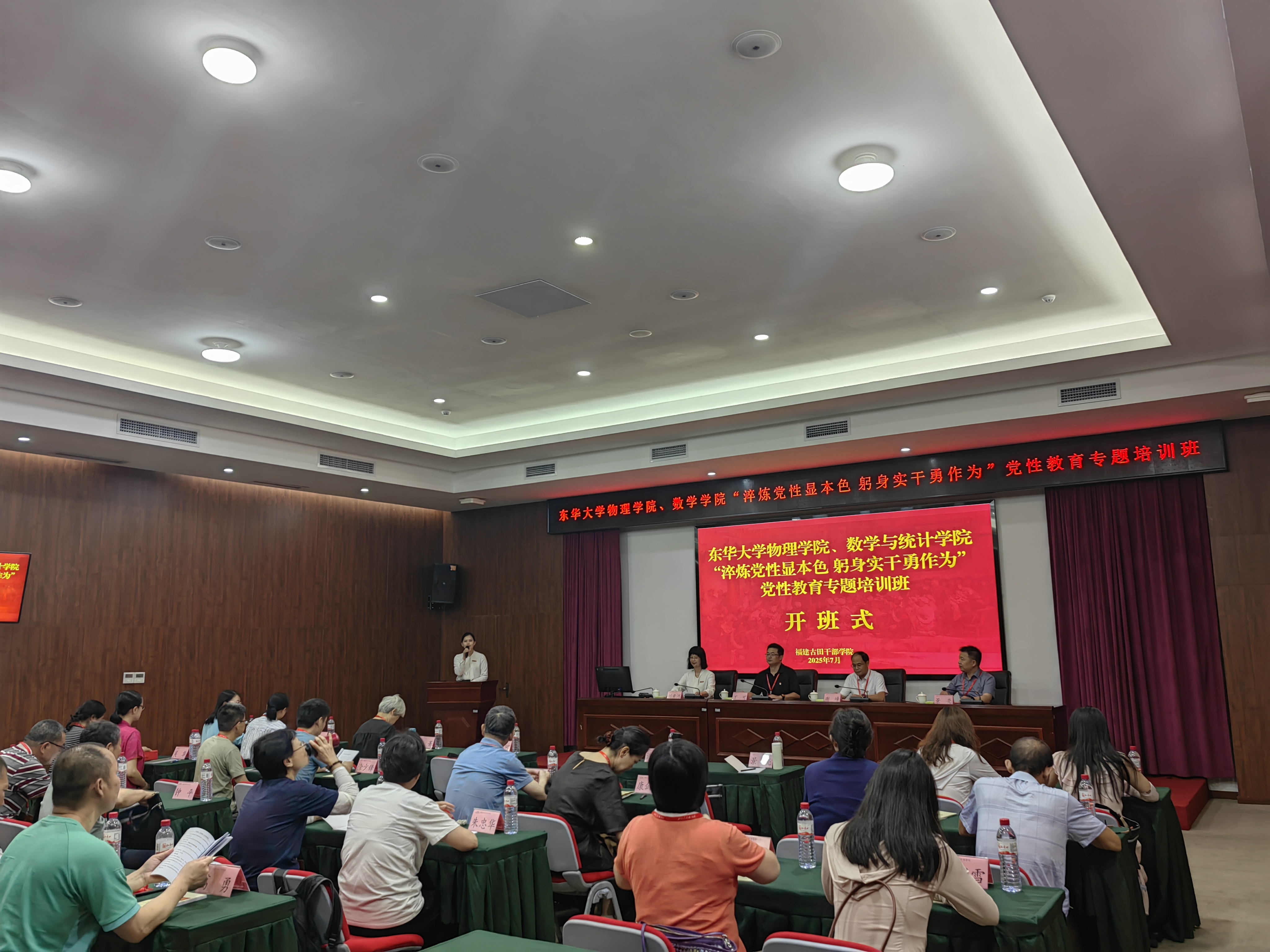 培训班开班式在古田干部学院信息中心楼举行,古田干部学院党委委员、副院长,龙岩市委党校副校长刘黄河同志出席开班式并致欢迎辞。物理学院党委书记丁可在开班动员讲话中深刻阐述了此次培训的重要意义。他指出,学院党委始终将传承红色基因、锤炼党性修养作为加强干部队伍建设的重中之重,在古田培训,正是要在党的政治工作源头活水处,深化对“思想建党、政治建军”这一根本原则的领悟,从古田会议精神中汲取强大精神力量,为不断推动学院各项事业高质量发展、全面推进教育强国建设寻根溯源、强基铸魂。他强调,全体学员要珍惜学习机会,端正学习态度,做到深学、活用、真悟:一要筑牢信仰之基,凝聚“国之大者”的忠诚志气;二要砥砺奋斗之志,凝聚“披荆斩棘”的担当锐气;三要恪守为师之责,凝聚“行为世范”的浩然正气。